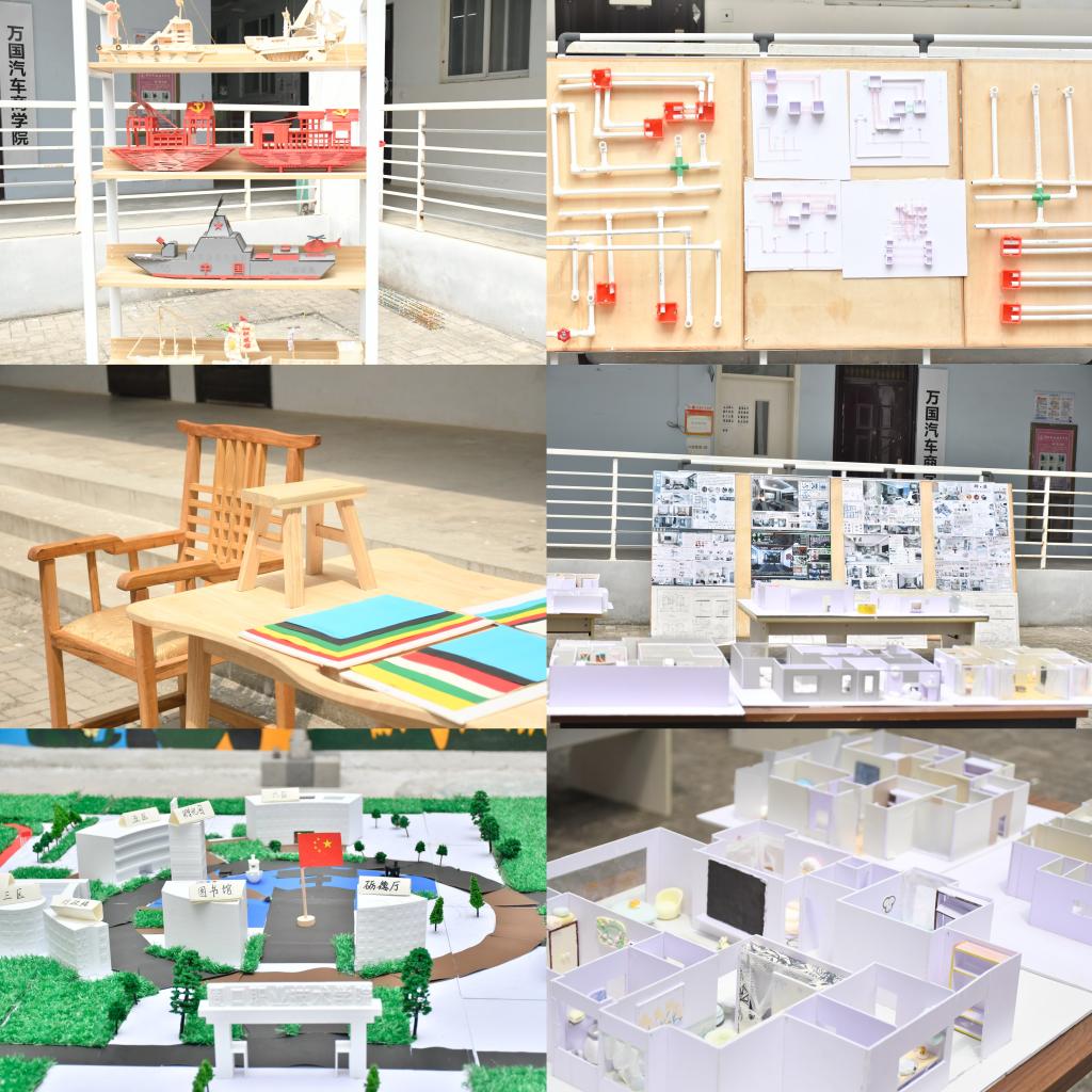 走进成果展示现场,就仿佛踏入了一个创意与实践交织的奇妙世界。榫卯相扣的木质桌椅模型,以天然纹理与精湛工艺,诠释传统木工技艺的深厚底蕴与现代设计美学的灵动融合;砖块与轮胎构筑的创意装置,打破材料边界,将废弃之物重塑为艺术景致,是环保理念与创意思维碰撞出的独特火花;建筑微缩模型以精妙布局和细腻摆件,勾勒空间秩序与生活情境,每一寸皆为专业知识与艺术感知交融的结晶;校园沙盘以逼真还原,倾注学子对校园的深情厚意,一景一物尽显人文关怀与美学追求;科技机械模型构思精巧,结构部件间彰显理性逻辑与探索热忱,引得观者凝眸研讨,折射出学子在专业前沿无畏开拓的精神锋芒;再看那一张张设计精美的图纸,每一笔每一划都蕴含着同学们的心血,图纸上详细的标注、精确的尺寸和富有创意的设计思路,展现出他们在专业领域不断探索进取的精神。